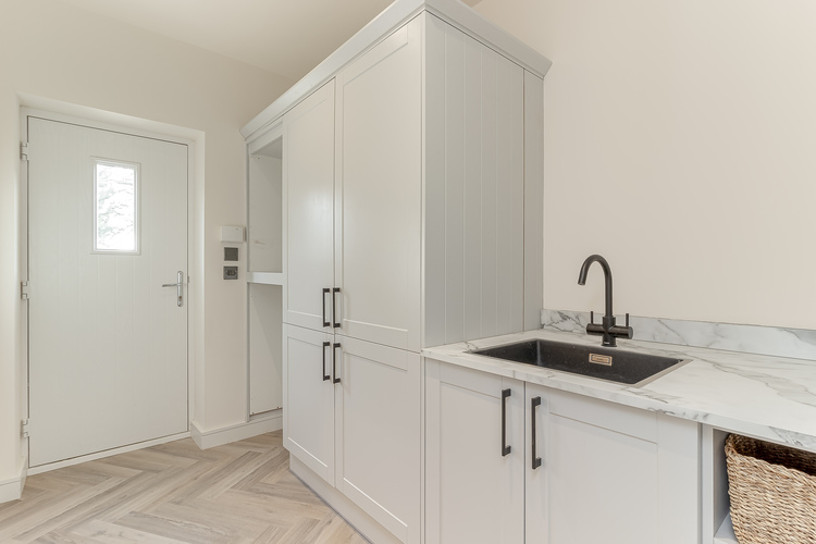 There are good use of quality oak pocket doors that slide into a utility room from where beyond there is a guest cloakroom with quality fitments including a Villeroy and Boch hand wash basin and toilet. The utility room features space for a washing machine and dryer and also a side entrance door to the side garden and parking area.