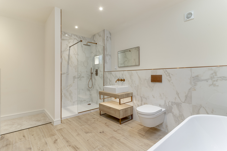 Lastly, there is a luxury house shower room that doubles up as the guest cloakroom with underfloor heating, central heated towel rail Villeroy and Boch toilet, hand wash basin and walk-in shower with watering can shower head and wall mounted hand handheld shower attachment.
