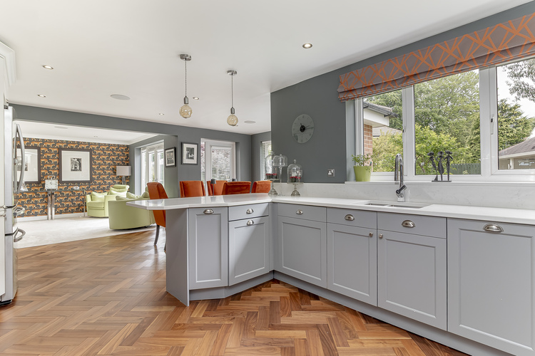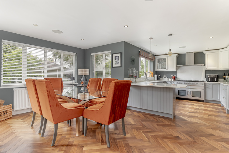 The kitchen includes quartz worktops with central peninsula breakfast bar , a gas/electric Rangemaster cooker, extractor, integrated dishwasher and space for an American fridge freezer. Leading off the kitchen is a separate utility room with practical side entrance door.