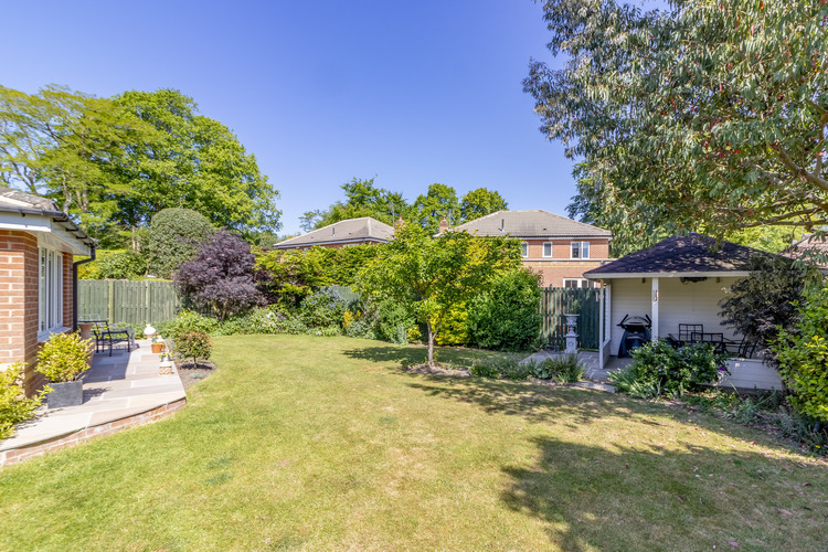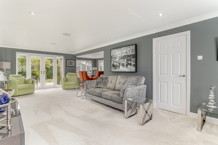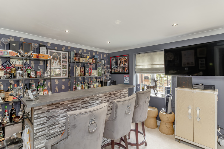 Twin sets of doors open out to the fully enclosed rear gardens with lawns that extend to the side of the house, stone patio lounging area, and a second sun terrace with covered seating space that boasts lighting and power for outdoor heaters making it ideal for outdoor entertaining all year round.