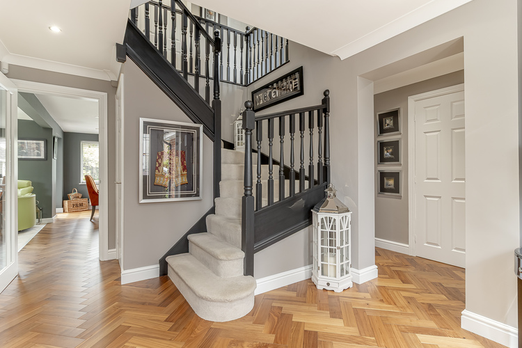 The house opens via a covered entrance to the central reception hall with guest w/c and useful under stairs storage. Walnut Parquet flooring is laid in a herring bone fashion and extends