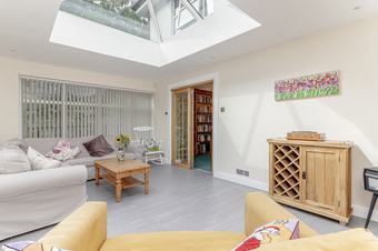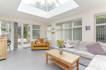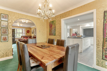 The living accommodation comprises entrance porch with downstairs w/c, entrance hall with oak staircase and oak double doors leading into the spacious lounge with feature fireplace with an electric fire. An open plan dining room which opens into the modern fitted Tom Howley kitchen with integrated dishwasher, fridge and freezer, induction hob, Neff double ovens, Neff microwave, pantry cupboard, soapstone worktops, and a central island. There is a separate utility room with a door leading out into the garden. There is a second reception room which is currently used as an office but could be used as a playroom/snug with a door leading into the integral garage (measuring 17’3 x 8’) with power and lighting which offers useful storage. To the rear of the property is the garden room with underfloor heating, a sky lantern and double doors opening out onto the garden.
