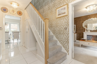 The property briefly comprises: Inviting reception hall with tiled floor, guest cloakroom, bay fronted lounge with Feature fireplace, study and a most impressive 30 foot wide living family kitchen with soft seating area, dining area and range of upgraded base cupboards, drawers and matching eye level storage cupboards with an integrated Bosch filter hood, ceramic hob dishwasher sink unit Bosch fan assisted oven and Bosch Combi microwave and fridge freezer. There’s a separate utility room with space and plumbing for a washing machine and dryer and a door that leads into integral garage, which has a door to the rear garden.