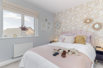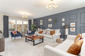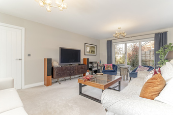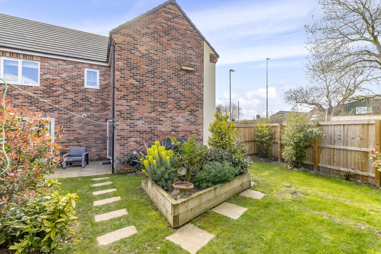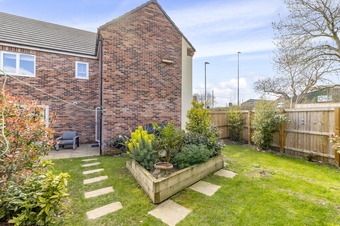 Outside to the front of the property is are well-stocked flowerbeds and a shaped lawn that runs to the side of the property. To the other side is the large driveway which offers off-street parking for multiple vehicles and leads to the double garage (measuring 21 × 19′6). The garage, previously the site office, has power, lighting, is fully plastered and insulated and has the flooring down so could be used as a studio or office. To the rear the garden is fully enclosed with a lawn, decking area and a patio off the lounge and dining area creating a lovely entertaining and barbecue area.