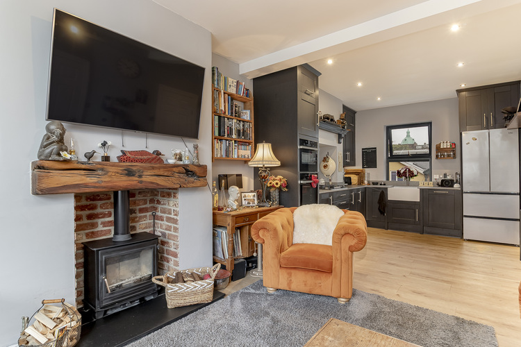 This recently renovated home offers gas fired central heating and newly fitted UPVC windows throughout. The flexible living accommodation comprises of three floors. At ground level, entrance hall , separate cloakroom, open plan living kitchen with a lovely bay window and feature fireplace with a wood burning stove. The modern kitchen includes Neff single oven, Neff Combi oven, AEG five gas ring hob, an integrated dishwasher and an American fridge/freezer which is included in the sale.