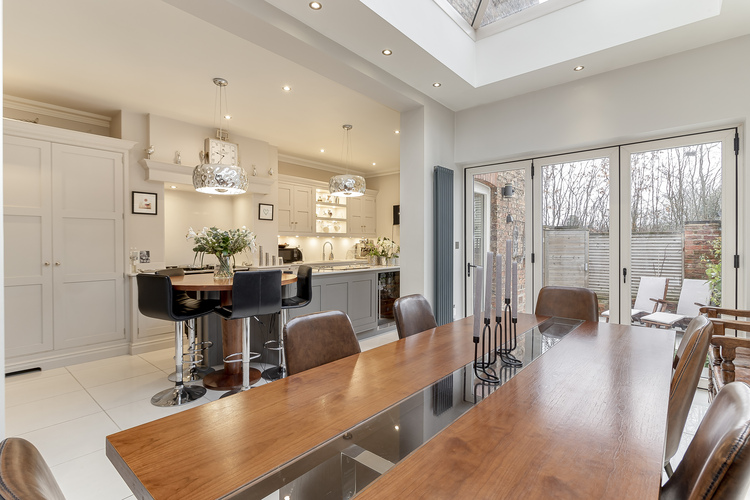 There is a separate sitting room with an insert Stovax log burning fire and steps lead down to a beautiful living family kitchen with glazed lantern to the dining area, and a stunning Tom Howley fitted kitchen with a breakfast island. There are Neff integrated appliances that feature, electric oven with grill, fridge, induction hob, gas-fired Aga, dishwasher, waste disposal, a Quooker instant boiling tap, drinks fridge. Additionally, there are folding doors that provide access to a delightful rear enclosed garden area with off-street parking beyond. There is a useful basement store, that is arranged as three keeping cellars.