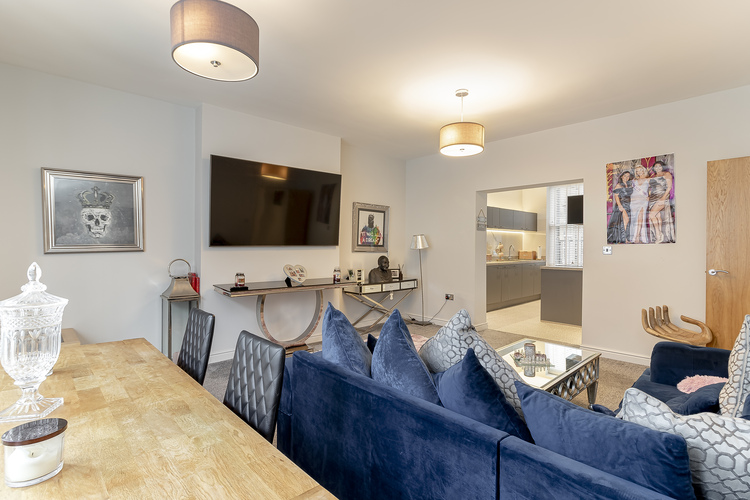 The apartment has a secure ground floor entrance lobby, with carpeted staircase approach to the first floor. Elegant reception hall with a useful storage cupboard. The hallway leads to an open plan lounge with double fronted bay window.