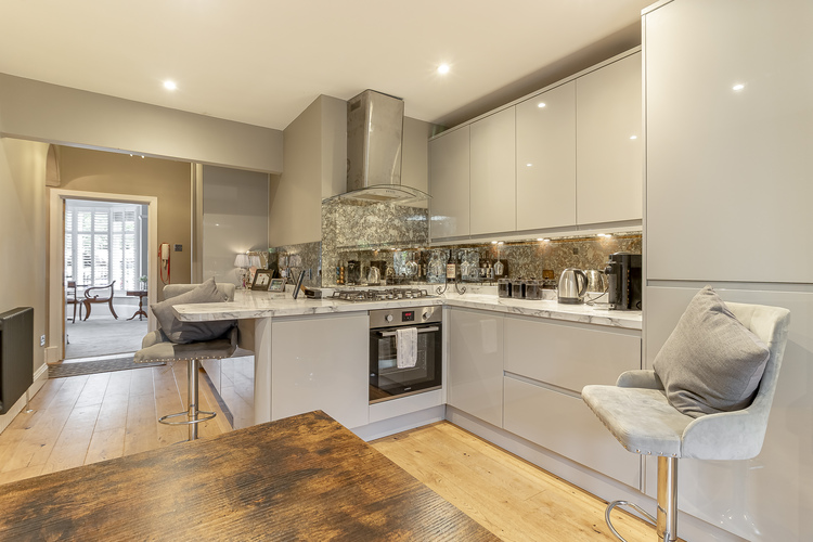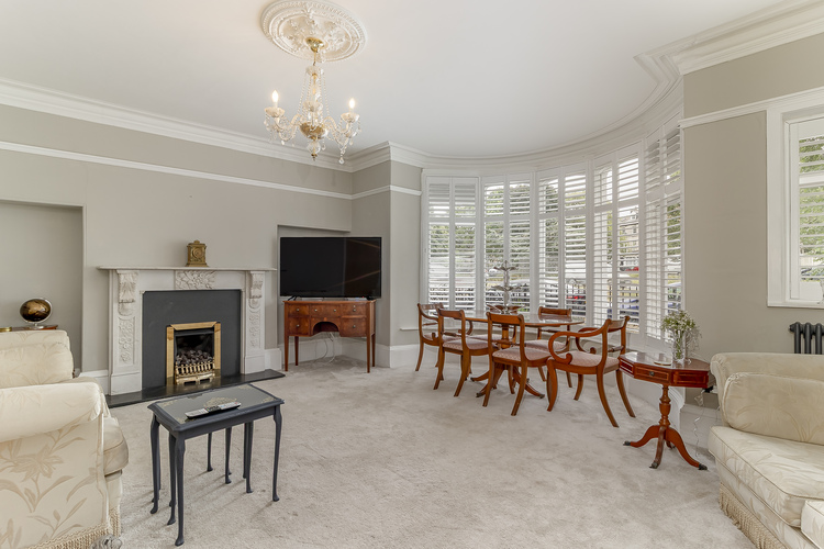 With gas fired central heating and UPVC double glazing the living accommodation comprises; secure communal entrance with secure intercom system, entrance hallway which leads to the stunning lounge with feature gas living flame fire and fireplace, large curved bay window with bespoke fitted shutters, high ceilings and character features throughout. From the entrance hall it opens out into the modern fitted kitchen with all integrated appliances which include, fridge, freezer, dishwasher, washing machine, gas hob and single oven. There are breakfast bar area and space for a dining table with double doors leading out into the courtyard garden.