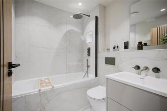 Stairs rise from the reception hallway to a generous first-floor landing, giving access to a generous rear-aspect principal bedroom with a contemporary en suite shower room, and to a further front-aspect double bedroom, along with a modern family bathroom. Both bedrooms benefit from large, almost full-height picture windows with sky lanterns, flooding the rooms with natural light. The two bathrooms are similarly styled, each with Lapicida tiles, wall-hung WCs, and LED mirrors.