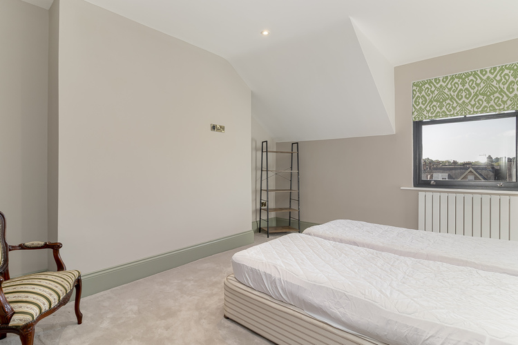 Ascend to the first floor, where the landing leads around to the luxurious master bedroom suite. This private sanctuary begins with a walk-through dressing area, where bespoke, intelligently planned wardrobes maximize storage. A secret door adds a touch of intrigue, opening into a stunning ensuite shower room with a large walk-in shower, WC, and basin. The bedroom itself is a haven of tranquillity. Adorned with exquisite Colefax & Fowler wallpaper, it features another charming fireplace with an electric log-burning stove and bespoke fitted drawers. The magnificent bay window not only floods the room with light but also houses a show-stopping copper bath, positioned perfectly to enjoy serene views over the Valley Gardens as you soak. This floor also hosts a second, generously sized super king bedroom, equally beautiful with Colefax & Fowler wallpaper, wooden flooring, and bespoke built-in wardrobes. It benefits from its own ensuite with a walk-in shower, twin sinks and bath, making it an ideal suite for guests.