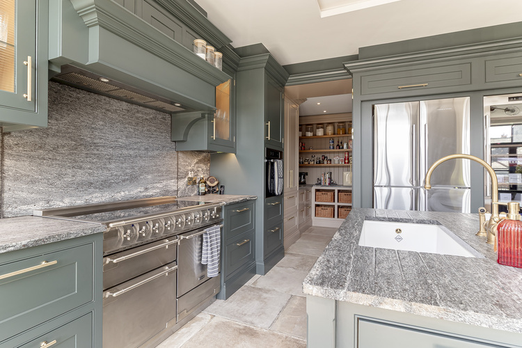 The bespoke kitchen is a chef’s dream, featuring hand-picked granite worktops and a suite of premium, integrated appliances. This includes a Fisher & Paykel American fridge-freezer, two dishwashers, a professional-grade Range cooker, a Miele oven, and an impressive 128-bottle Fisher & Paykel wine chiller. At the centre of it all, the large island incorporates a Shaws of Darwin Belfast sink with an instant hot water tap and a second fridge. A cleverly concealed door reveals a walk-in pantry, thoughtfully designed with a breakfast bar, a large larder cupboard, and a charming blackboard wall—perfect for family notes and shopping lists. From the dining area, two sets of French doors open onto a sun-drenched, south-facing wraparound terrace, seamlessly blending the interior and exterior to create a fabulous, flowing entertaining space.
