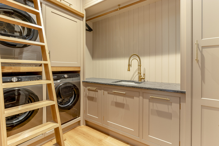 In a feat of clever design, the main utility room is conveniently located on this level. It offers bespoke fitted cupboards, two new Samsung washing machines with add in feature and a new Samsung dryer, a Shaws of Darwin sink, and an industrial-style clothes rail. Overhead units, accessed by a solid Oak ladder, provide further ingenious storage solutions.