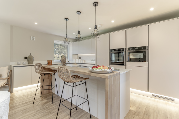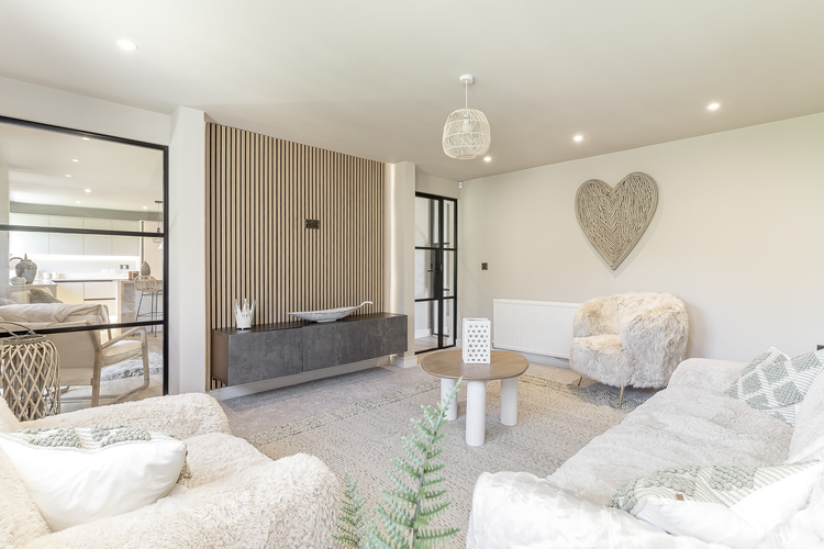With gas fired central heating the living accommodation comprises; entrance hall with downstairs w/c to the left hand side, there are Crittal doors that lead into the lounge which has a feature media wall and a full length floor to ceiling window looking into the kitchen. The spacious open plan living kitchen creates a fantastic entertaining space with doors leading out into the garden. The kitchen includes; Quartz worktops, solid oak breakfast bar, Neff n50 single multifunction oven slide & hide, Neff n50 microwave oven with hot air, AEG flex zone induction venting hob, CDA integrated tower fridge, full height, CDA integrated frost free tower freezer, full height, AEG fully integrated sliding hinge dishwasher, Large sink and boiling hot water tap. There is a separate Utility room with fitted units, boiler cupboard, plumbing for a washing machine and space for a tumble dryer with worktop space next to sink.