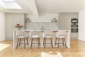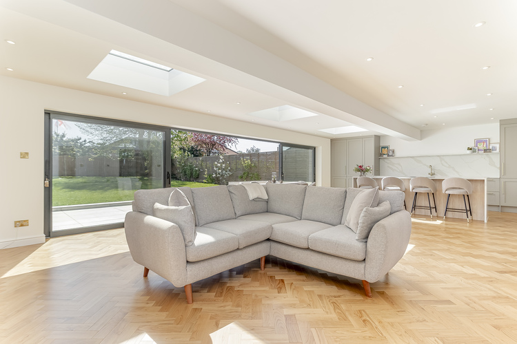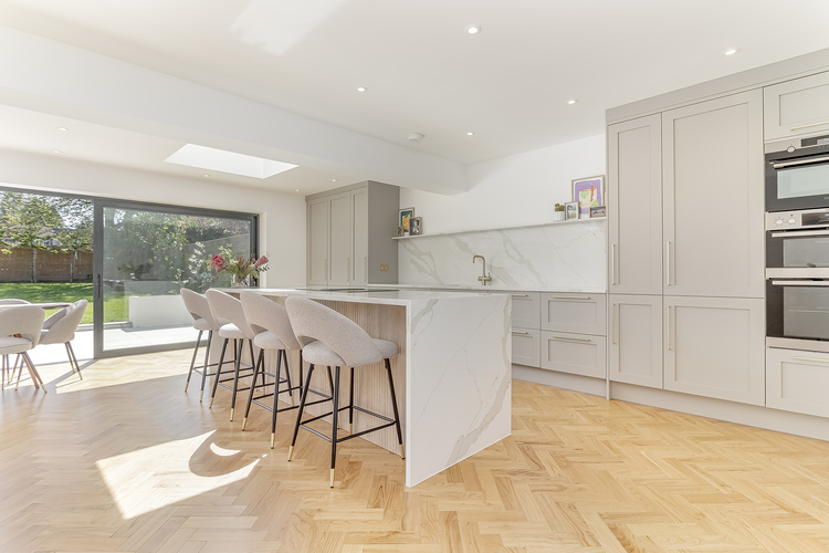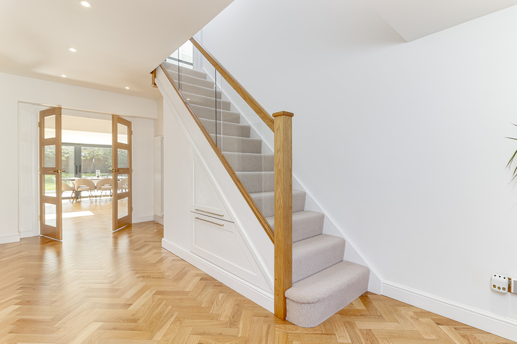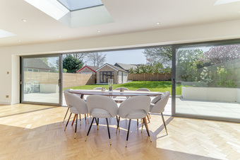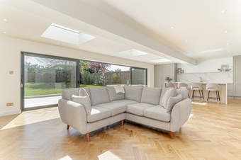 With gas fired central heating and double glazing the living accommodation comprises; spacious entrance hall with solid wood herringbone flooring throughout the ground floor, spacious lounge with feature fireplace, an amazing open plan living dining kitchen with underfloor heating and sliding doors leading out onto the south facing garden creating the perfect entertaining space. The modern fitted kitchen includes quartz worktops, AEG double ovens, microwave oven, integrated dishwasher, fridge, freezer, induction hob with downward ducted venting, instant hot water tap and breakfast bar. Additionally on the ground floor there is a spacious fourth bedroom which is currently used as a gym, a good sized separate utility room, useful storage cupboard and downstairs shower room with wet room shower, w/c and hand basin.