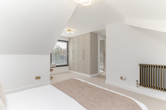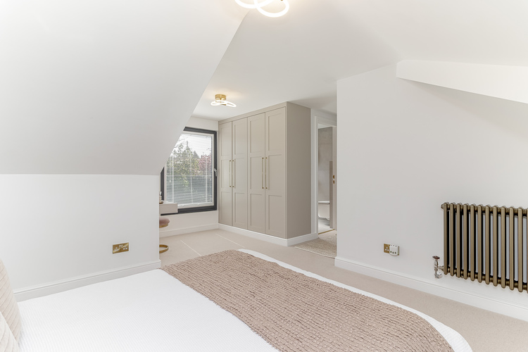 On the first floor is the master bedroom suite which has a dressing area with bespoke fitted wardrobes and drawers into the eaves and ensuite shower room with wet room shower, w/c and hand basin. Additionally there are two further good size double bedrooms and a house bathroom with separate bath, w/c and hand basin.