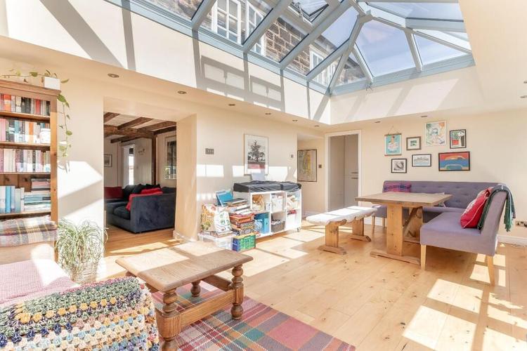 With gas fired central heating the living accommodation comprises; entrance hall leading into the spacious living room with a wood burning stove, feature fireplace and engineered solid wood flooring which continues into the second reception room, modern breakfast kitchen with quartz worktops, breakfast bar, integrated appliances including full length fridge and freezer, dishwasher, five ring gas hob, Zanussi double oven, a separate utility room and an open plan dining area/second reception room with a stunning skylight and double doors leading out onto the rear garden creating a great entertaining space.