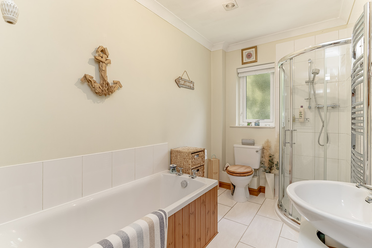 The bedroom accommodation is made up of the Master bedroom offers an ensuite shower room and two further bedrooms. The spacious house bathroom has both a full-size bath and corner shower cubicle.