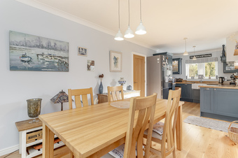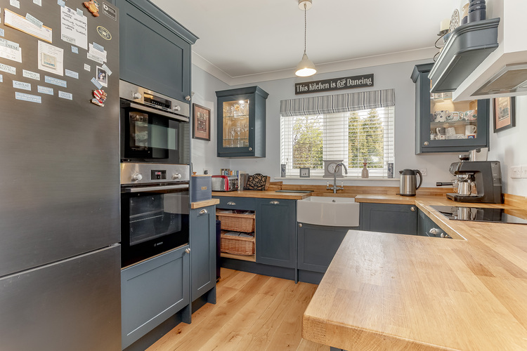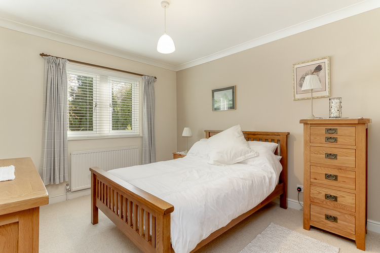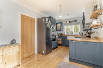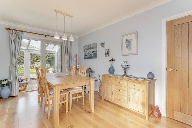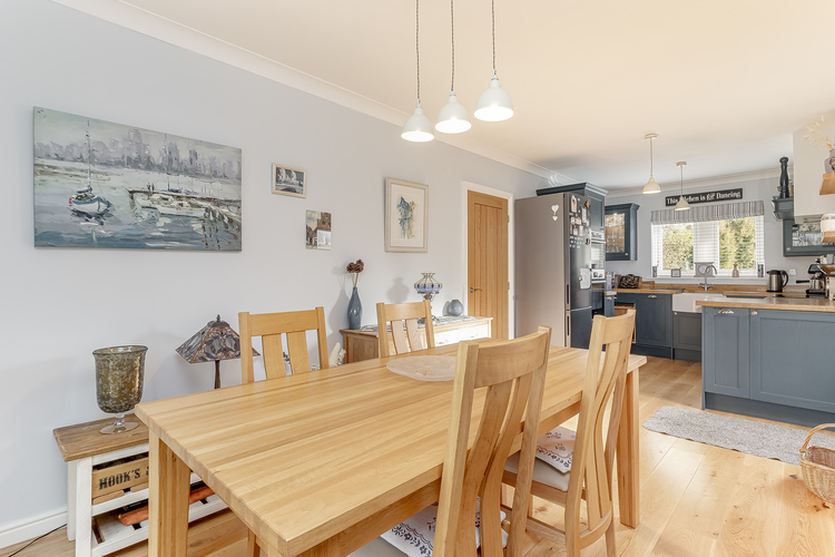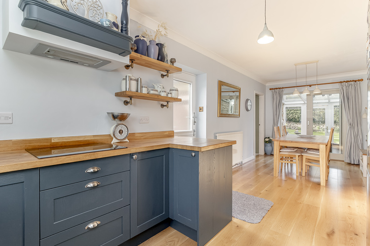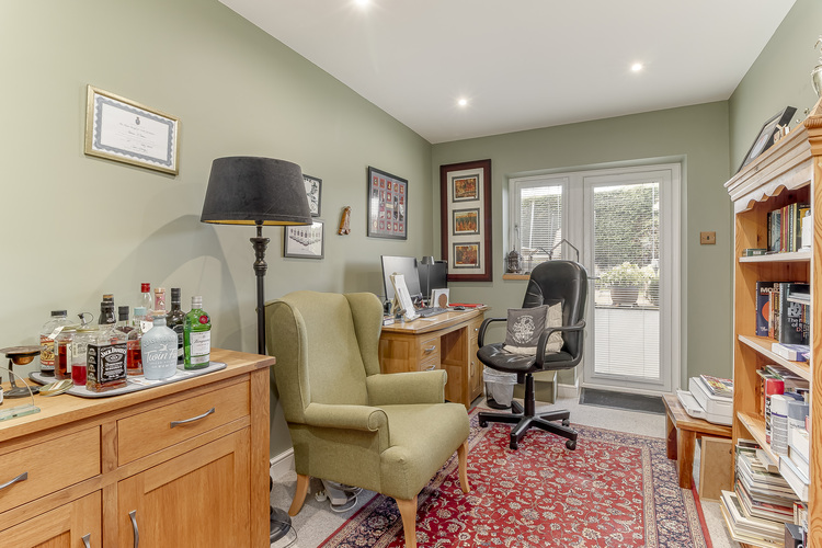 There is a spacious lounge with open fire, well appointed modern fitted dining kitchen with a good range of storage cupboards that includes a slimline dishwasher, Belfast sink, induction hob with extractor fan over and a double oven incorporating built-in microwave and grill. The dining room leads to a beautiful garden room with a door opening out to the private enclosed west facing gardens from where there are stunning long distance views. There is also a sizable study/bedroom four, again with a door leading out to the rear garden.