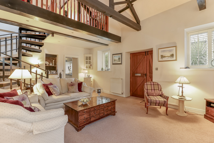 With gas fired central heating the living accommodation comprises, spacious lounge with vaulted ceilings and a feature fireplace which houses a wood burning stove, open plan dining kitchen with integrated appliances, hob, double oven, worktops and dining area. There is a rear hallway which leads to the back door and out onto the garden. There is a spiral staircase leading to a mezzanine level and study area with useful eaves storage.