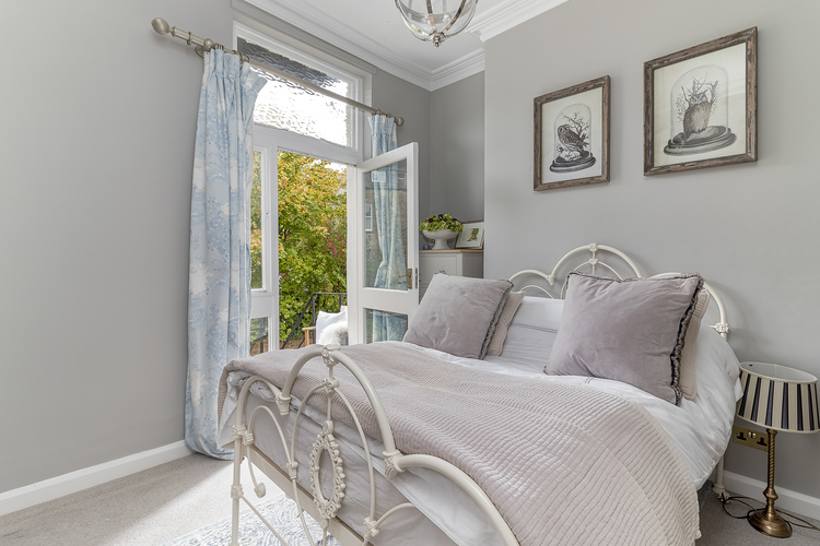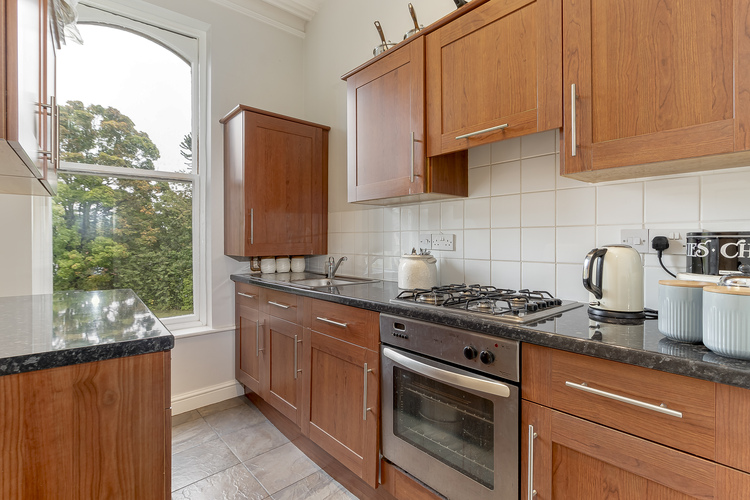 a ceiling cornicing to a beautiful bayfront lounge that overlooks the front lawned Crescent. There is a fitted kitchen with integrated appliances. The largest bedroom has a rear balcony/fire escape which provides a pleasant sitting area with a pretty view. There is a further bedroom and a bathroom with a Mira sport electric shower over the bath.