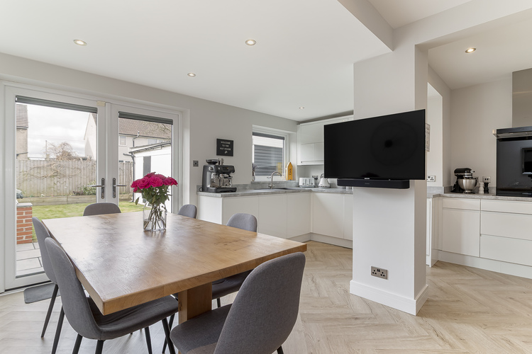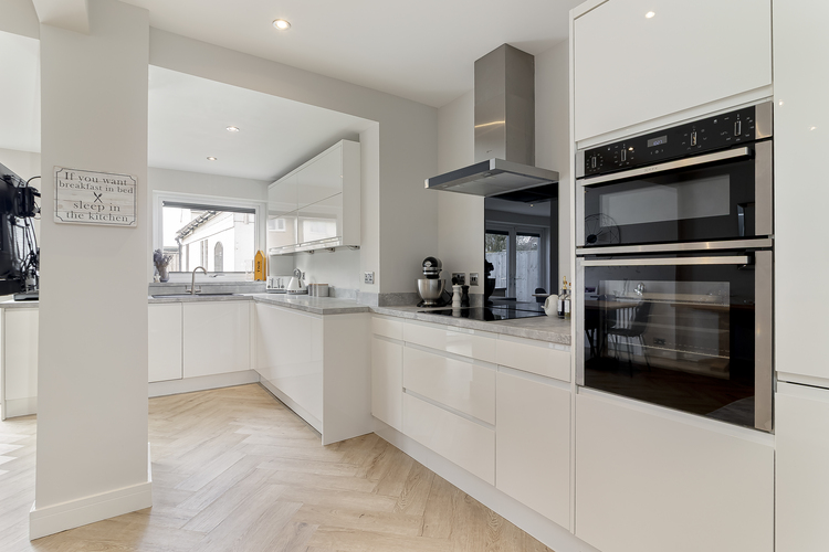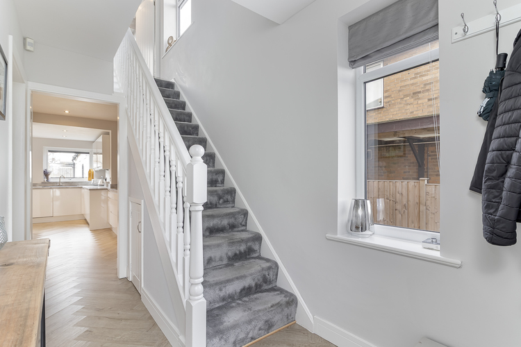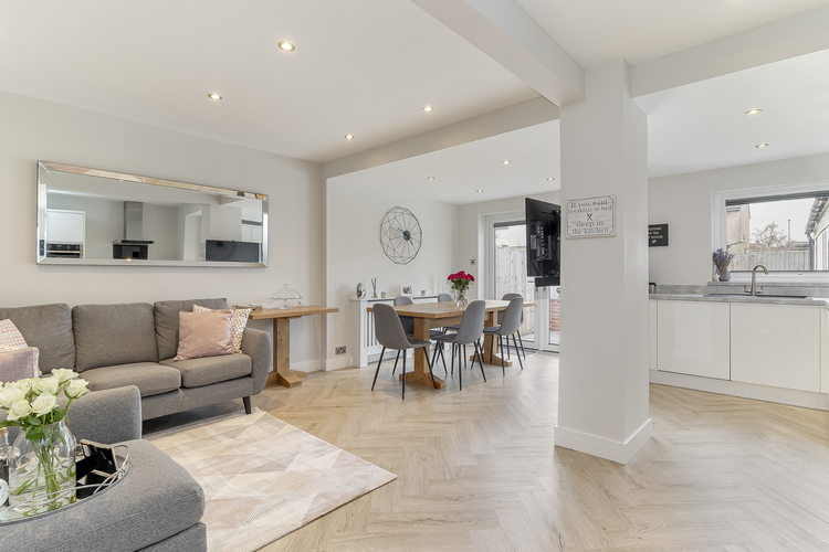 With UPVC double glazing throughout, gas fired central heating which is controlled by Hive and alarm system the living accommodation comprises; entrance hall with under stairs storage cupboard, spacious lounge with a large bay window, a stunning open plan living kitchen which creates superb entertaining space with space for seating and dining. The modern fitted kitchen includes Neff ovens and induction hob, integrated fridge, freezer dishwasher and washer/dryer and double doors leading out onto a south west facing patio area.