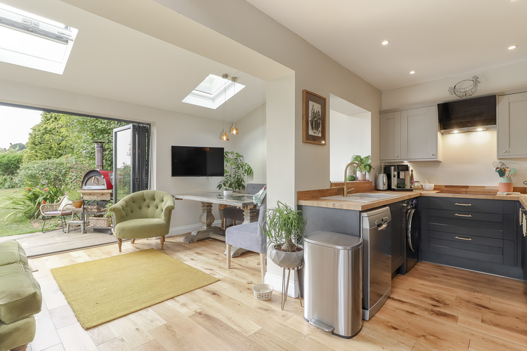 With central heating and double glazing the living accommodation comprises entrance hall, living room with wood burning stove, open plan living kitchen with a modern fitted kitchen units including an eye level oven, microwave oven, electric hob with extractor, space and plumbing for washing machine and dishwasher. The kitchen opens out into the extension which creates a fantastic open plan living space perfect for entertaining with bi folding doors leading out into the south west facing garden.