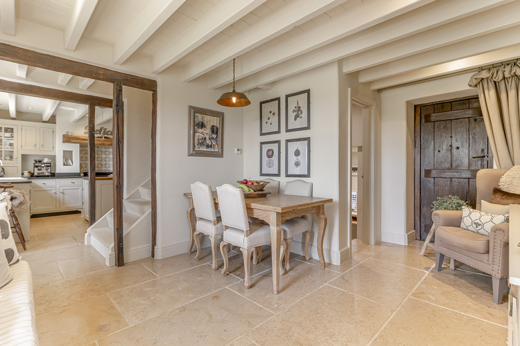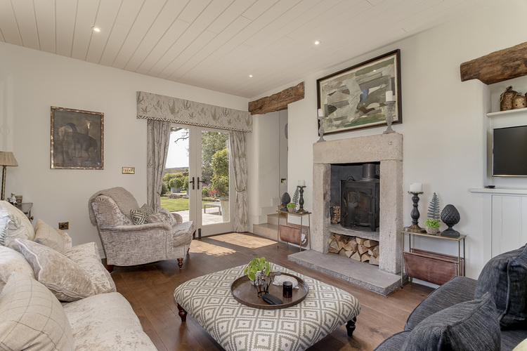 The main entrance opens into an impressive dining hall—perfect for entertaining—with exposed beams and a welcoming atmosphere. Adjacent is a study with a useful built-in storage cupboard. The spacious sitting room is a standout feature, with a raised stone hearth, inset log-burning stove, and French doors opening onto the rear garden—bringing the outdoors in.