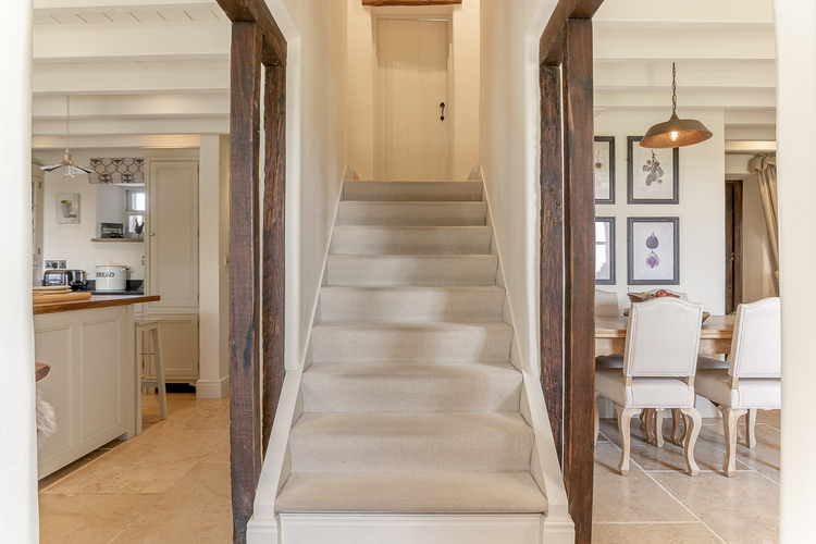 A wide staircase leads to a charming split-level landing with exposed ceiling beams and feature windows.