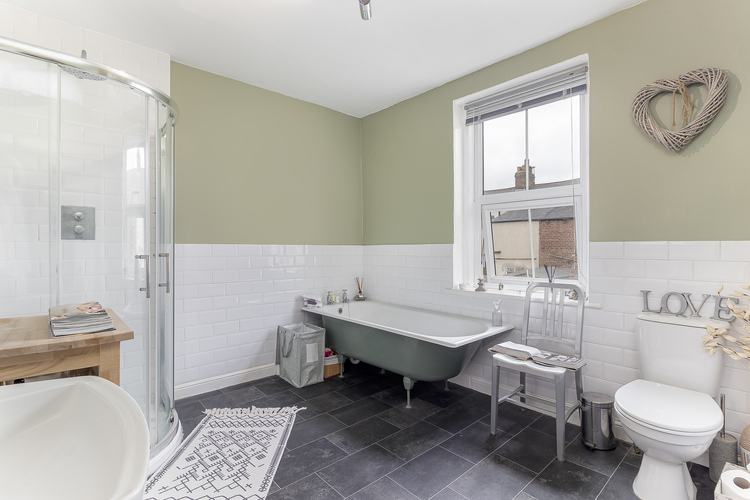 At first floor there is the principal bedroom that is currently used as a sitting room that features double glazed windows to the front and a decorative fireplace. There is a full width character house bathroom with both a walk-in corner shower and freestanding bath.