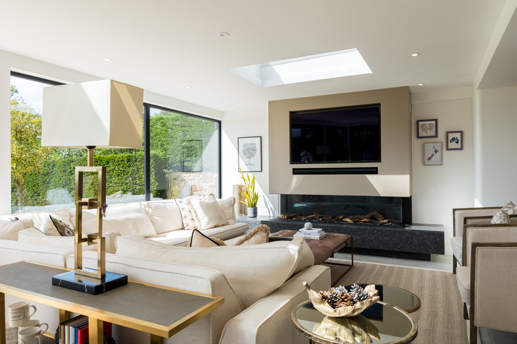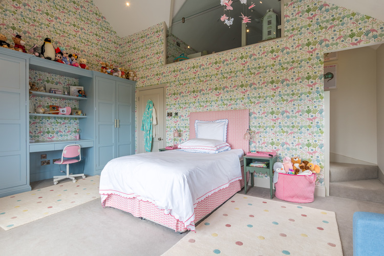 At the heart of the home lies a state-of-the-art open plan kitchen flowing seamlessly between living and entertaining spaces, framed by glass bi-folding doors overlooking the stunning countryside backdrop. The sitting room is flooded with natural light featuring exposed timber beams, and a statement designer chandelier, all gazing over a gorgeous private courtyard with mature trees and manicured planting. For the ultimate in at-home leisure, the residence features a dedicated cinema room, perfect for family film nights, and a climate-controlled wine fridge to showcase your finest vintages.